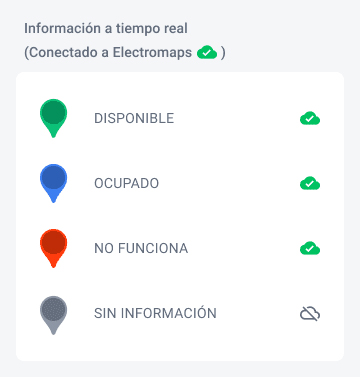 Los marcadores verdes en el mapa señalan que esos puntos están enlazados con Electromaps, lo que significa que proporcionan información actualizada en tiempo real.